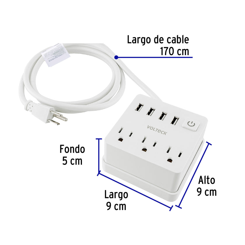 Multicontacto 16 AWG doméstico 3 entradas 4 ptos USB, blanco