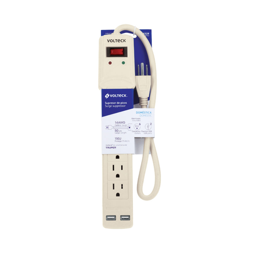 Multicontacto 16 AWG 6 entradas 2 ptos. USB sup. 150J marfil