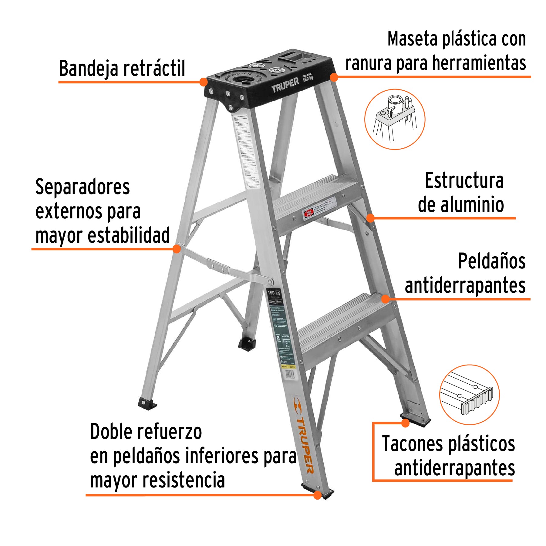 - Doble refuerzo en peldaños inferiores para mayor resistencia