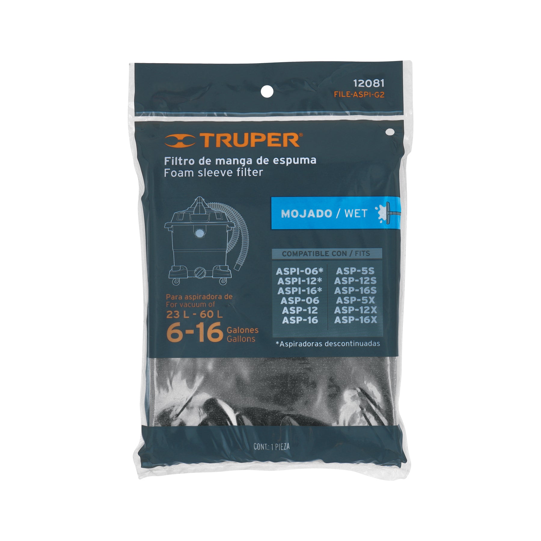 - Para aspiradora modelo ASP-06, ASP-12, ASP-16, ASP-5S, ASP12S, ASP-16S, ASP-5X, ASP-12X, ASP-16X, ASPI-06 (Descontinuada), ASPI-12 (Descontinuada) y ASPI-16 (Descontinuada) marca Truper®