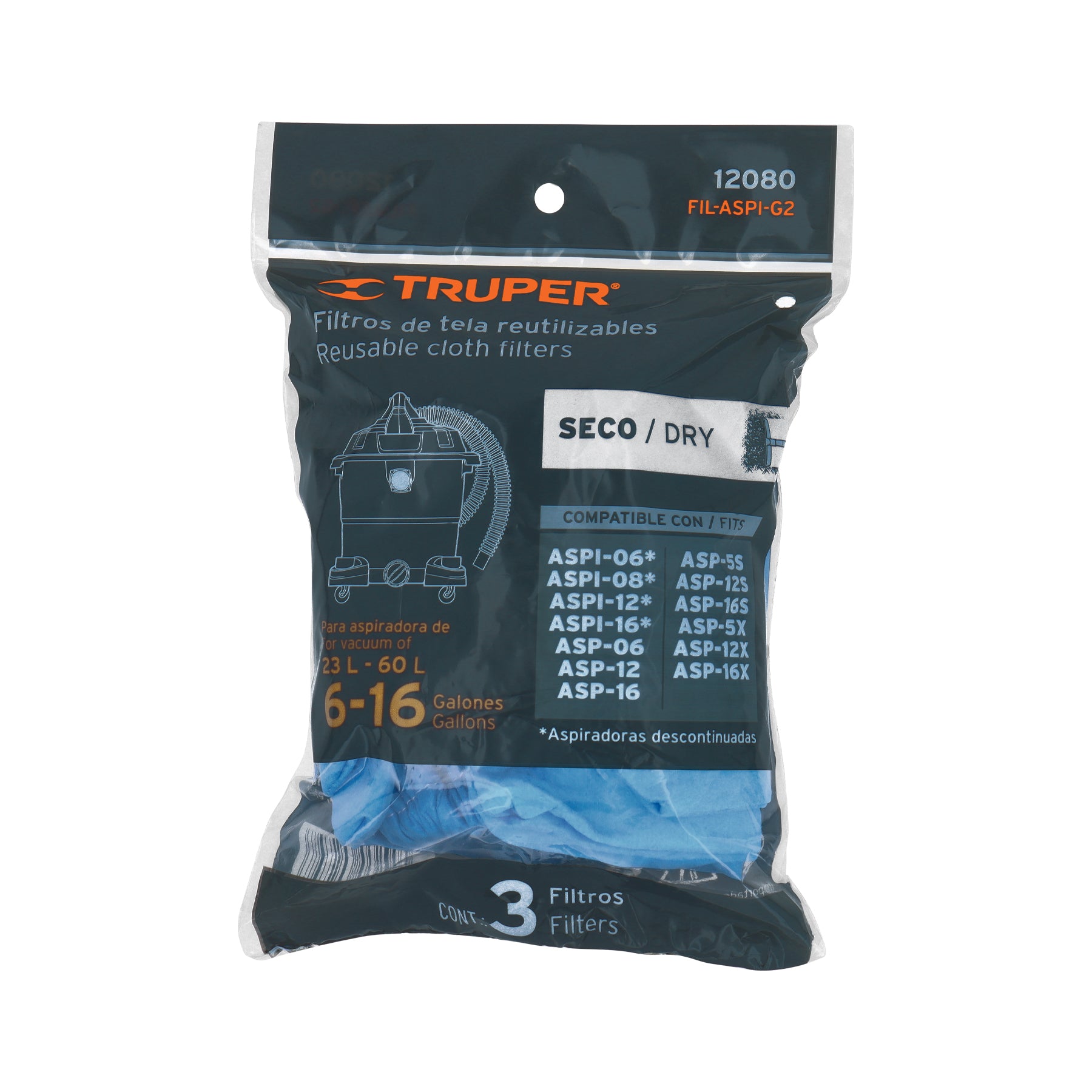 - Para aspiradora modelos ASP-06, ASP-12, ASP-16, ASP-5S, ASP12S, ASP-16S, ASP-5X, ASP-12X, ASP-16X, ASPI-06 (Descontinuada), ASPI-08 (Descontinuada), ASPI-12 (Descontinuada) y ASPI-16 (Descontinuada) marca Truper®