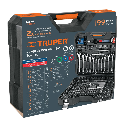 Juego de dados, cuadro 1/4, 3/8 y 1/2", 199 piezas, std y mm