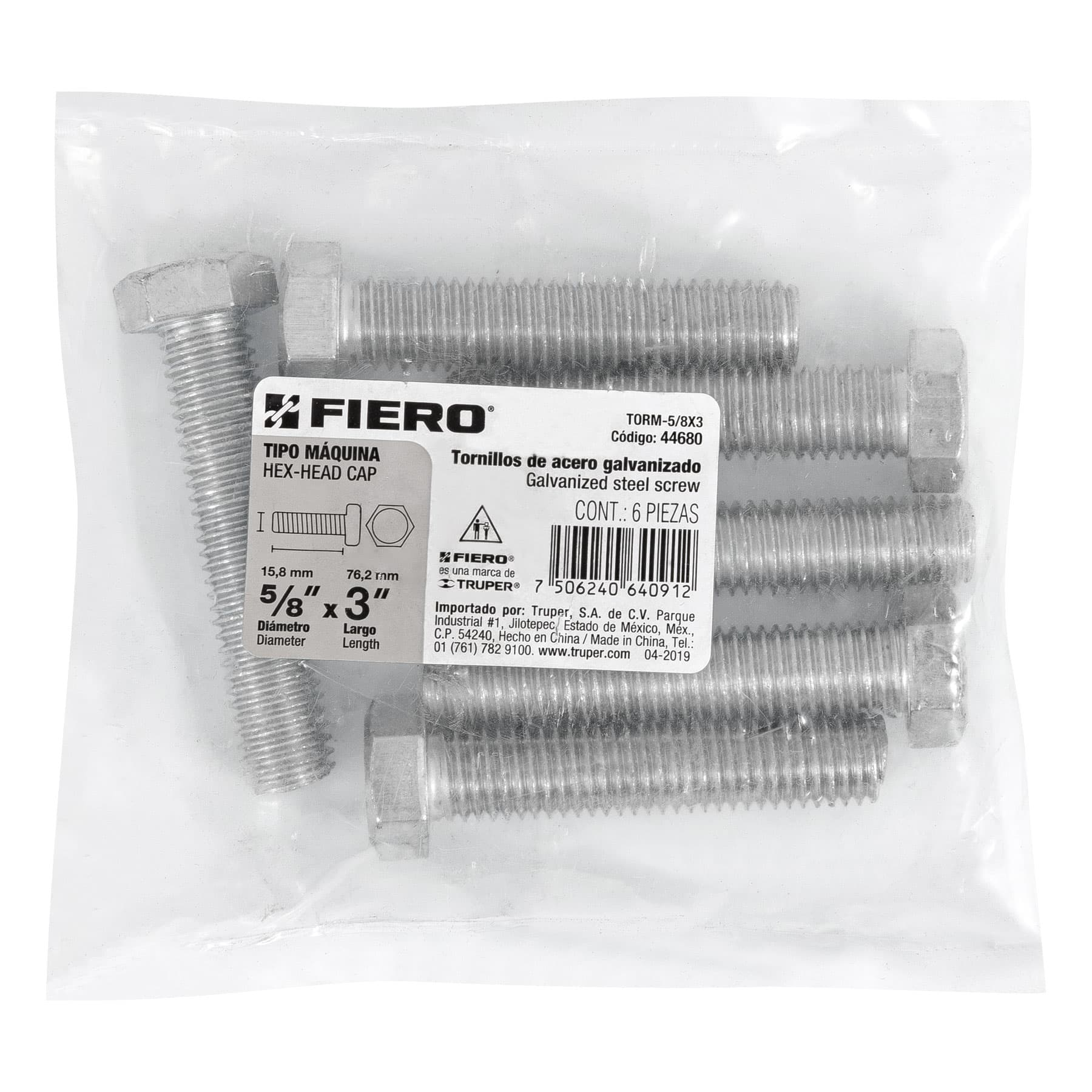 Tornillo acero galvanizado tipo máquina, 5/8X3", 6 pzas